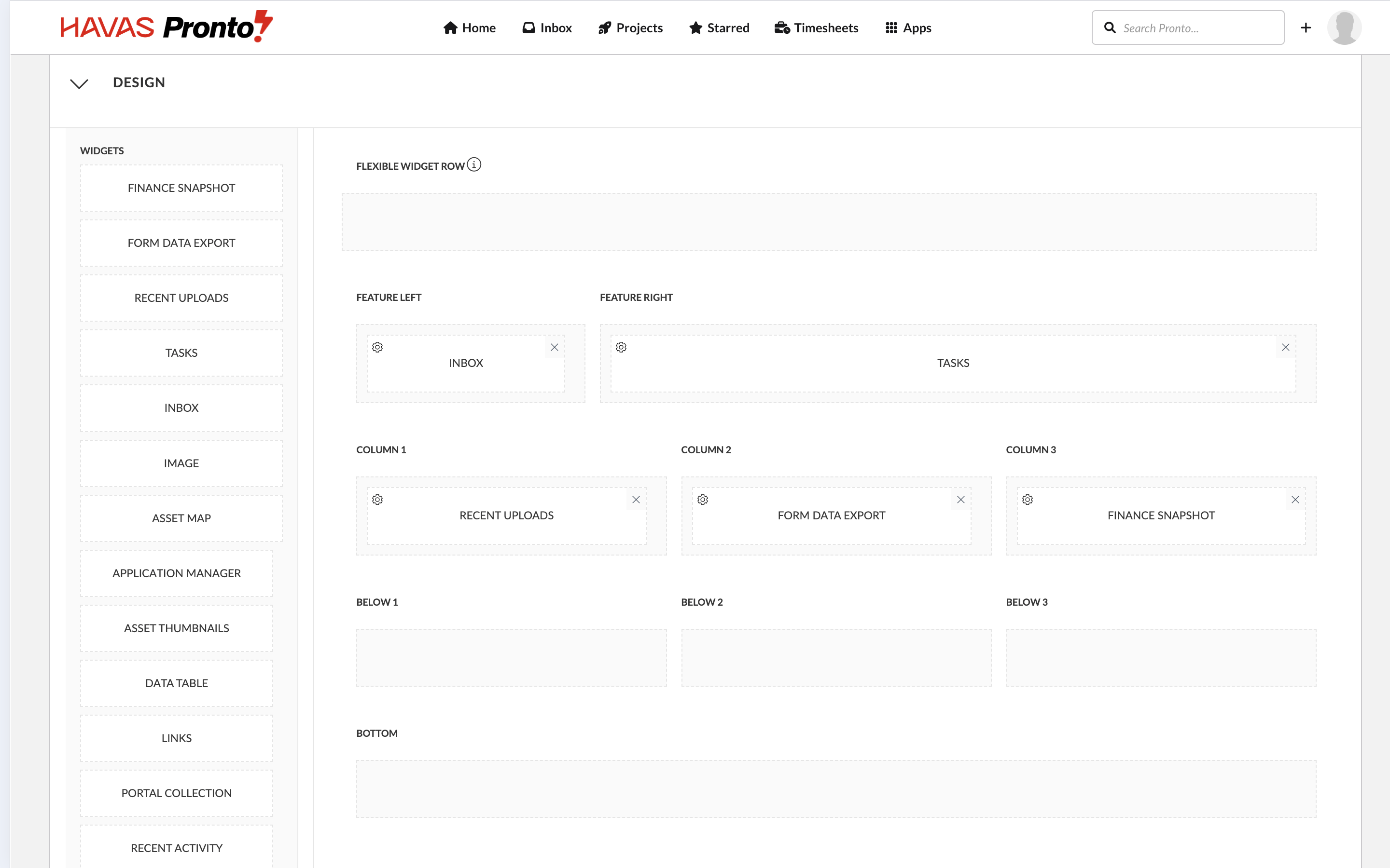 - In the design section, drag in widgets and arrange your layout.