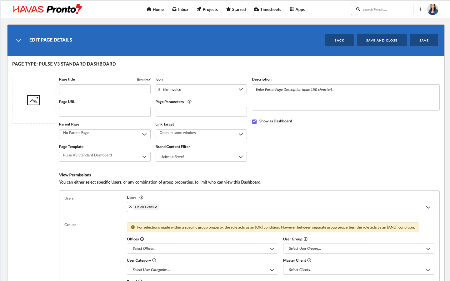 When you create a new dashboard you’ll land on the Edit Page view. From here you choose a template, add a name and short description, and (if you’re a Dashboard Manager) control who can see or edit it.