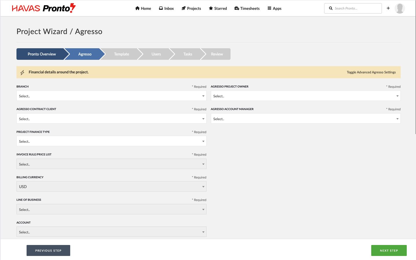 Once you’ve completed the Pronto project overview, the next step is the Agresso tab. This is where you’ll input key finance details required for integration with Agresso. The information entered here is sent directly to your external finance system.
