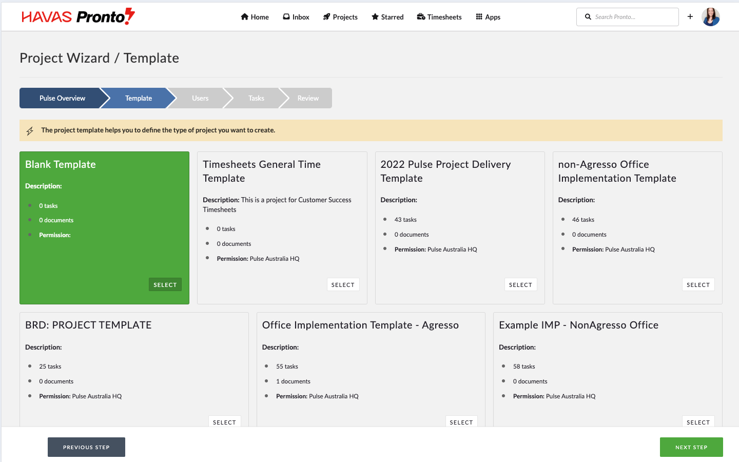 As covered earlier, Pronto lets you create new Projects from pre-configured Project Templates.