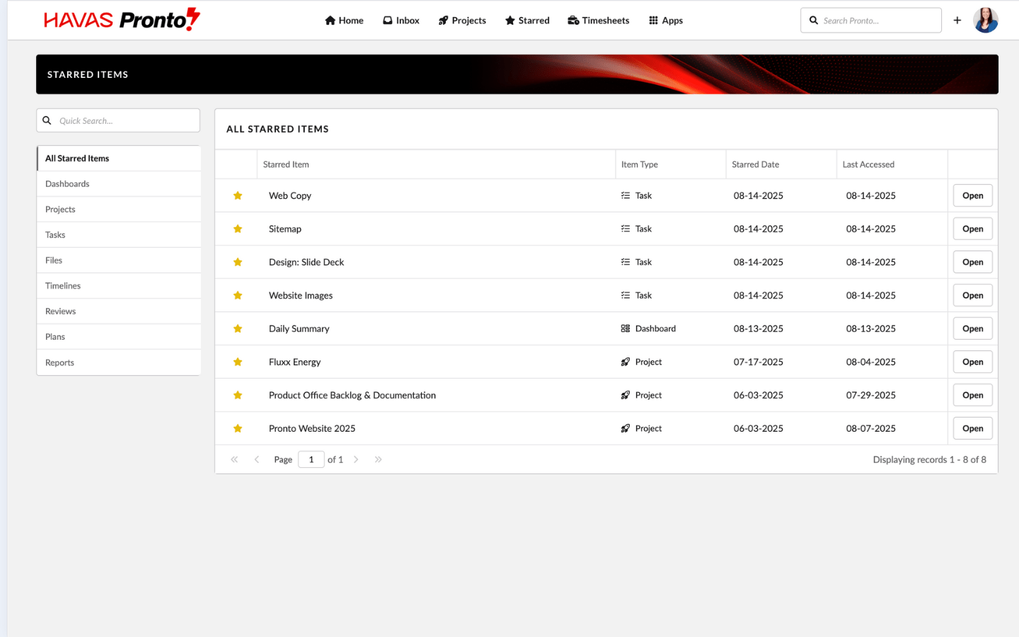 The starred items feature lets you bookmark important objects in Pronto like projects, tasks, files, timelines, plans, reviews, and reports so you can get back to them quickly. Think of it as your personal shortlist of essentials.