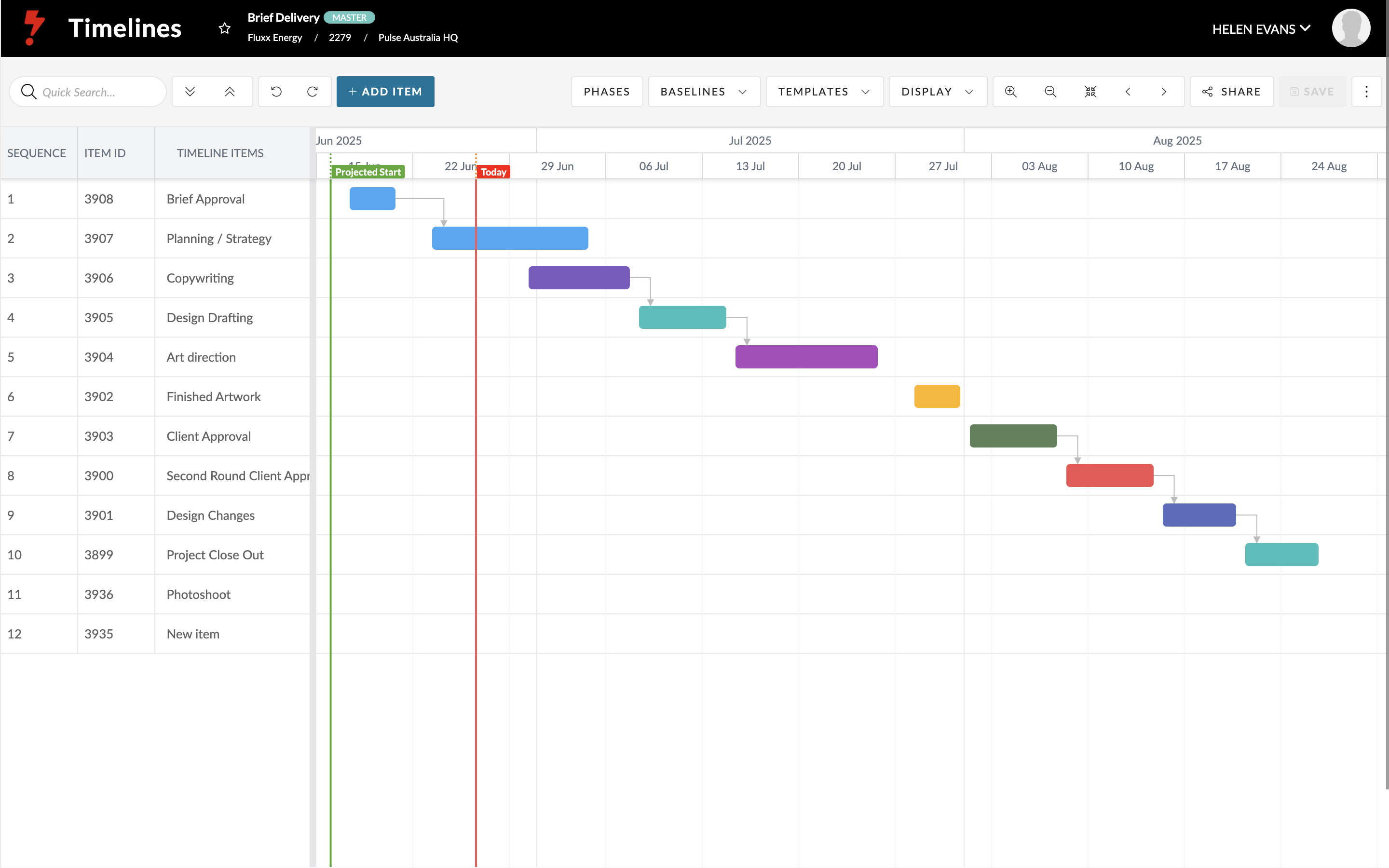 • Linked tasks display a green date field in the Task list. Hovering shows the linked Timeline and project details.